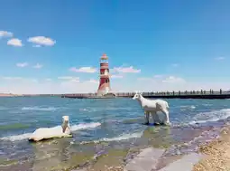 After entering the scenic area, we rented a four-person bicycle with a canopy and rode along the forest path towards the lake. The first thing that caught our eye was a sea of flowers, with two types of flowers, Celosia and Corn Poppy, blooming beautifully in the fresh air and bright sunshine. When we arrived at the lakeside, we saw a huge Guanyin statue on a small island extending into the lake, and on the shore dock, there was a large rock with the three big characters of 'Swan Lake' engraved on it, where some people were taking commemorative photos.