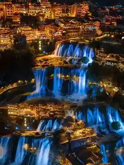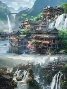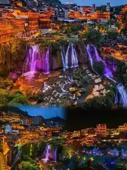 1. Furong Town Waterfall: The iconic landmark of Furong Town, the waterfall is 60 meters high and 40 meters wide, cascading down the cliff in two tiers with tremendous momentum, like an inverted Milky Way. Walking along the plank road beside the waterfall, you can experience the magical feeling of the "Water Curtain Cave," with cool mist refreshing your face and dispelling the summer heat. At night, the lights illuminate the waterfall in colorful hues, beautifully complementing the surrounding stilted buildings—truly magnificent.