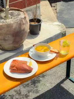 A delicious and light pumpkin soup and fresh baguette sandwich