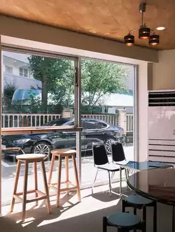 The interior features bright wooden furniture and an olive-green bar, creating a natural wood-tone atmosphere. Sunlight pours in, adding a warm and inviting touch to the space☀️