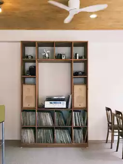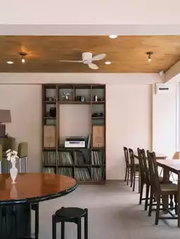 The walls are adorned with LP records and retro camera equipment, enhancing the vintage charm. Through the windows, the lush green scenery evokes the refreshing essence of summer📸