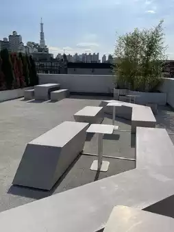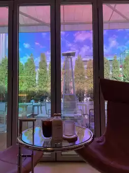 The outdoor terrace, visible through the large windows, reflects light mysteriously, as if covered in a holographic film, sometimes turning pink or purple depending on the sunlight. Sitting by the window, sipping coffee, it feels like time has truly stopped. 🩵