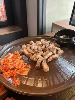 The samgyeopsal is thickly cut with a perfect balance of fat and lean meat, releasing a savory aroma as it grills🥢. The exterior is crispy while the inside remains juicy, bursting with flavor. The accompanying fresh lettuce wraps, sauces, and kimchi further enhance the taste of the meat. The subtle charcoal-grilled aroma adds to the overall satisfaction throughout the meal. It's a great dish to enjoy with rice or as a side for drinks.