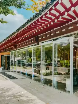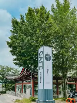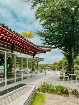 A large cafe in front of Bulguksa Temple with a beautiful tile roof and full-glass walls that give off a Hanok vibe☕