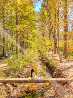 The single-log bridge photo zone is pretty, and the path between the trees is nice to walk on.