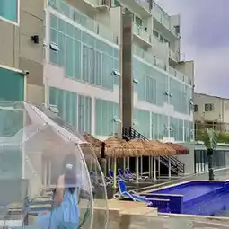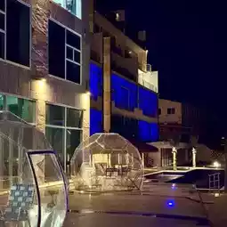 The outdoor space with a resort-like feel, such as a swimming pool, a transparent dome, and a swing photo zone, is connected to a large cafe next door,