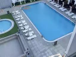 The hotel has a swimming pool and the breakfast restaurant was delicious.