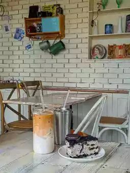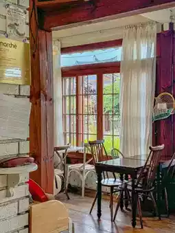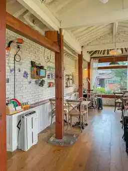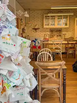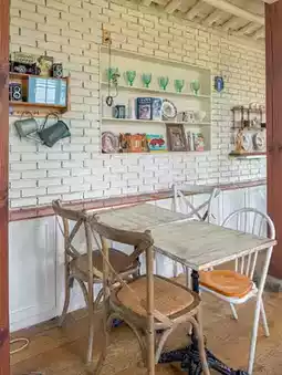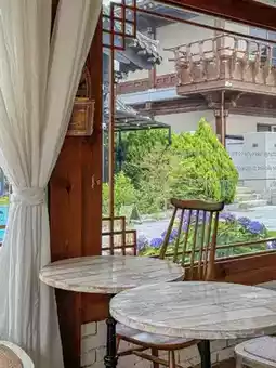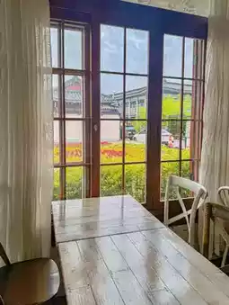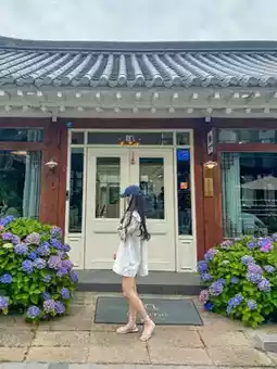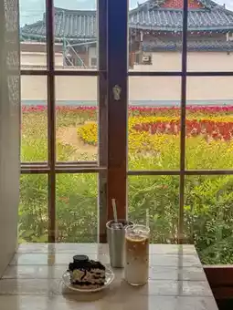 A cafe in Hwangridan-gil, Gyeongju with a pretty flower garden view,