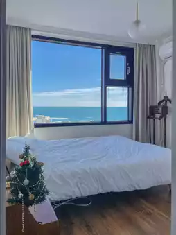 The bedroom, kitchen, and living room all feature large windows offering ocean views.
