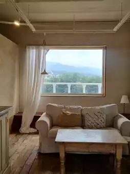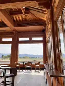 A cozy cafe with a modern and clean interior. Large windows allow natural light to flood in, creating a bright and comfortable ambiance.