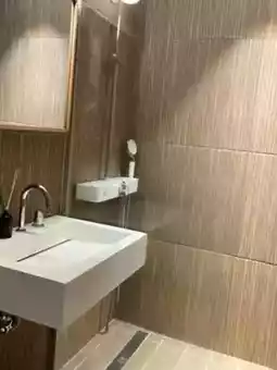and it was nice that it wasn't winter or anything. The bathroom has a moderately sized bathroom with a shower booth,
