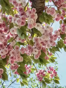 the beautiful colors of the leaves, the spring breeze, and the double cherry blossoms all come together to create a breathtaking landscape!