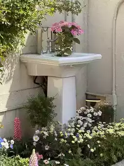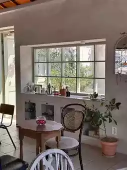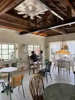 The interior features a garden and windows, a terrace, and a vintage-style interior with lots of flowers. ✨