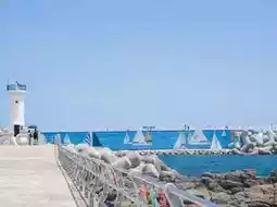 A clean photo spot 📸 greeted by a red lighthouse and breakwater. The fan-shaped columnar joint is about 500m away, with a round-trip course of 3km.