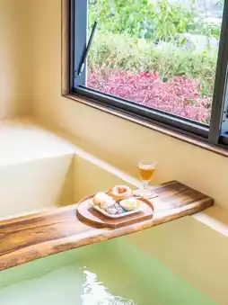 Enjoying bakery & wine while listening to the sound of leaves rustling in the Jacuzzi, is this heaven,,,🍷