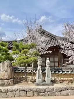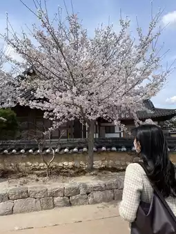 The combination of the Hanok view and cherry blossoms is so pretty.