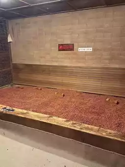 The wooden brown color of the pier's exterior resonates with the rocks of Halong Bay.
