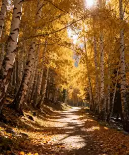 - The autumn birch forest is golden, with sunlight filtering through the leaves casting mottled shadows. Walking through the forest, the rustling of fallen leaves underfoot creates a strong atmosphere; the birch trunks are as white as snow, contrasting sharply with the golden leaves.