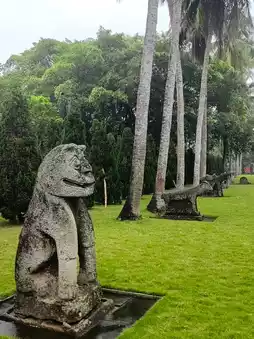The main entrance of Hai Rui's Tomb has a stone archway, with the words 'Eastern Guangdong's Righteous Qi' inscribed on the arch. Along the sides of the tomb path, there are stone sheep, stone horses, stone lions, stone turtles, and stone figures; to the south of the tomb mound stands a tombstone about three meters high. In front of the tombstone, there are five incense burners and candle holders, as well as a large offering table.