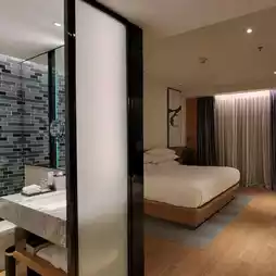 🛌 Amenities/Facilities: The facilities are very new, featuring a large floor-to-ceiling mirror, separate wet and dry bathroom areas, double sinks, smart mirror displays, smart toilet and bathtub, all with a high-tech feel. The TV supports screen casting for entertainment. Though multiple pillow options are available, some find the support insufficient. One minor drawback is the impractical hairdryer design, which requires a specific holding position.