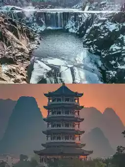 2️⃣ One of the famous attractions of Jingpo Lake, the waterfall freezes in winter, forming an ice waterfall, and the water below the waterfall never freezes