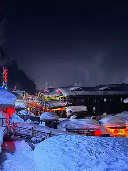 China Snow Town in winter resembles a fairytale world, with mountains and valleys covered in pristine white snow, and the air filled with a clean, crisp chill.
