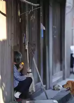 The wooden doors of the old street, the old lady sitting quietly on the steps eating, the dog sleeping in the cool shade beside the wooden door, oblivious to time, and the old bamboo pole simply hung next to the door with old-fashioned bamboo clip hangers.