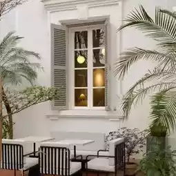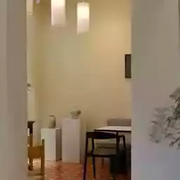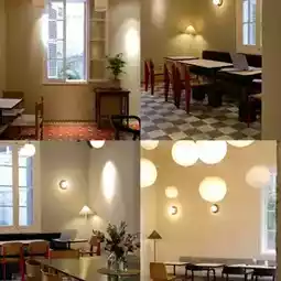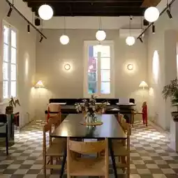 The space is spacious with a large yard and lots of trees. The high tables and chairs inside are suitable for working.