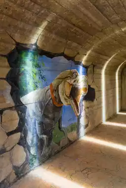 This cave was dug in the 1950s for special reasons. There is a Tyrannosaurus rex on the left wall, roaring. After passing through the arched stone gate, you will officially enter the tunnel.