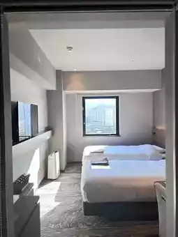 🌃 Stay in a 20 m² twin room with two spacious 110 cm single beds, perfect for a family. The multifunctional bedside table can be moved as needed to create a private and intimate living space. Open the curtains to reveal a stunning view of Mount Hakodate and the port, with the gentle sunset light providing a visual and spiritual feast. Your suitcase can be fully opened in the spacious room.