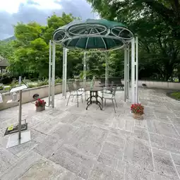The open terrace overlooking the green garden and the majestic Hakone mountains is wonderful, especially the authentic Italian gazebo (Western-style gazebo)!