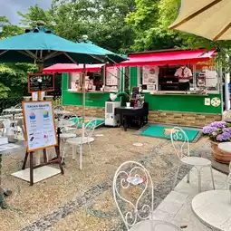 #Photogenic spot Carving patterns into glass by blowing sand, Caffe Terrazza Ukai (Cafe Terrazza Ukai) A cafe restaurant with an open terrace overlooking the green gardens and the majestic Hakone mountains