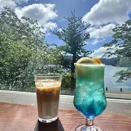 Lake Ashi Float: It looks as eye-catching as Lake Ashi, with blue and orange lemon soda water on the lower layer and iced vanilla ice cream on the upper layer