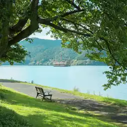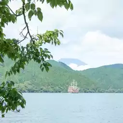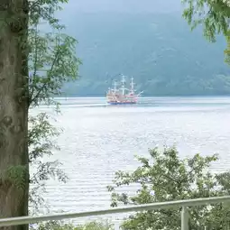 Time passes slowly while watching the sightseeing boats on Lake Ashi and people taking walks.