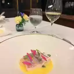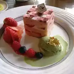 🌸The main restaurant "Fujiya" is surrounded by pillars with the theme of Shozo Yamaguchi, and you can enjoy French cuisine on the Okura Fujien blue rose plate with the Fujiya mark.
