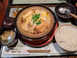 Tamura Ginkatsutei is famous for its tofu katsu stew, made by sandwiching pork mince between custom-made silver tofu, deep frying it, and simmering it in a clay pot.