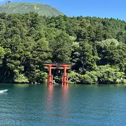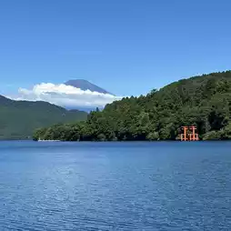 There is also a postcard with the real scene of Mount Fuji and Torii in the same frame 🏞️