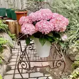The hydrangeas and fountains in the greenhouse are a spot that is full of exotic charm.