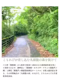 From the "Hakone-en" bus stop, you can walk along the forest trail, approximately 30-40 minutes. Walk along the lakeside promenade that connects Hakone-en Hotel The Prince Hakone Lake Ashi and the Hakone Lake Ashi Sightseeing Boat Kojiri Terminal at the lake's edge. The entrance to Kuzuryu Forest is at the midpoint, and it's about a 30-minute walk one way from either.