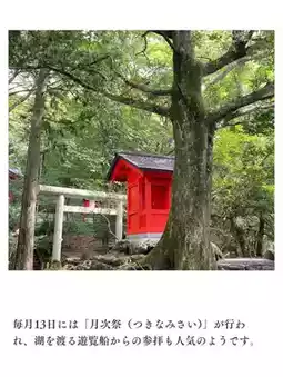 The "Tsukinamisai" (Monthly Festival) is held on the 13th of each month, and worshippers are also popular from sightseeing boats across the lake.