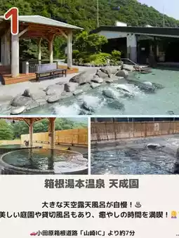 Carefully selected by a former travel agency! Delivering travel information for Gen Z office workers that offers great value and local experiences! For the latest information, follow us on @KawaTabi✈️KantoOutings🧳 ---------------------------------------------------- See post details below👇 What are you all interested in? Let us know in the comments!🙏   ♨️ Enjoy the ultimate hot springs in Hakone! Recommended hot spring spots for day trips and overnight stays! 🌿① Hakone Yumoto Onsen Tenseien: Boasting a large open-air bath in the sky! Enjoy a relaxing time with a beautiful garden and private baths.💆♀️✨🚗 By car: Approximately 7 minutes from Yamazaki Interchange.📍 Address: 682 Yumoto, Hakone-machi, Ashigarashimo-gun, Kanagawa Prefecture