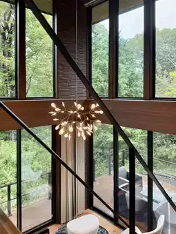 The living room, with its impressive atrium and large windows, is filled with luxury furniture from around the world, including an arflex sofa and Grande Papilio by B&B Italia. The lighting is by Moooi Heracleum. The entire space feels like a design showroom, with its changing appearance between day and night. Equipped with a large-screen projector and a Weber BBQ grill, you can enjoy movies and meals while overlooking the forest.