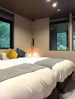 The hot spring water, 100% sourced from Owakudani Onsen, is milky white and soft on the skin, leaving you feeling moisturized after a bath. Soaking while gazing out the large windows at the forest is truly blissful. At night, the moonlight streamed in, creating a soothing experience that made you feel one with nature.