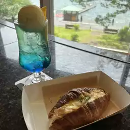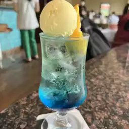 The cafe operates on a one-order system, and the blue sky-colored cream soda is recommended