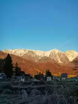 🏠It's not snow season yet, so I stayed at a guesthouse in the village, where I could see the morning sun shining on the snow-capped mountains.