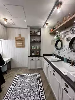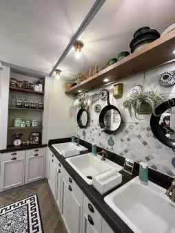 The mirror in the washroom is a frying pan, and kitchen utensils and baking molds for sweets are attached to the wall or hung from iron.