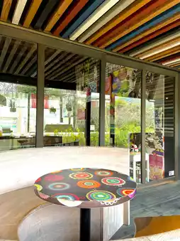 The attached cafe is also decorated with fabric panels, giving it a stylish feel!