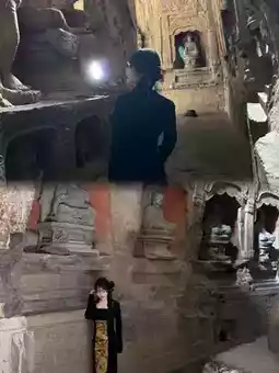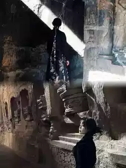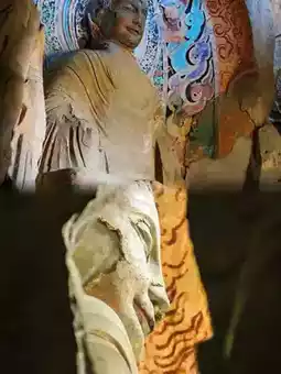 The North Cave has three main caves: the Great Buddha Cave, the Shakyamuni Cave, and the Sutra Cave. The scale and exquisite beauty of the Great Buddha Cave are breathtaking. The three-faced Buddha is 5 meters high, and here you can see the rare backlight flame, headlight flame, and water flame in the same frame as the Buddha statue. The sunlight shining through the high cave entrance is very beautiful.