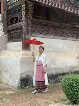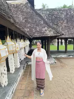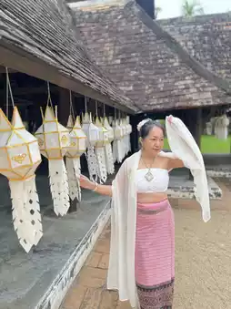 A brief history, but we came today to follow in the footsteps of Kasalong Songpeep. We'll be wearing Lanna costumes and taking photos. The costume rental shop is right in front of the temple for 150 baht. Dressing, shoes, and accessories are provided free of charge. Hair and makeup are provided.