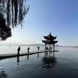 The emerald green water of the lake, the dried golden shade of yellow of tree leaves and the clear sky in winter at the dusk is completely breath taking view of the West lake. The cute little birds swimming in the lake even forming the lively and the beauty into the picture of the lake.#historicallandmarks #familytrip ##2024wish